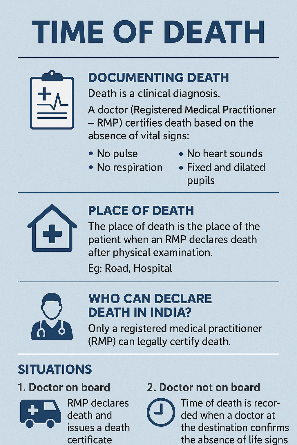 - As per Indian law, only a registered medical practitioner (RMP) can legally certify death. Paramedics, nurses, or ambulance staff cannot certify and issue a death certificate.